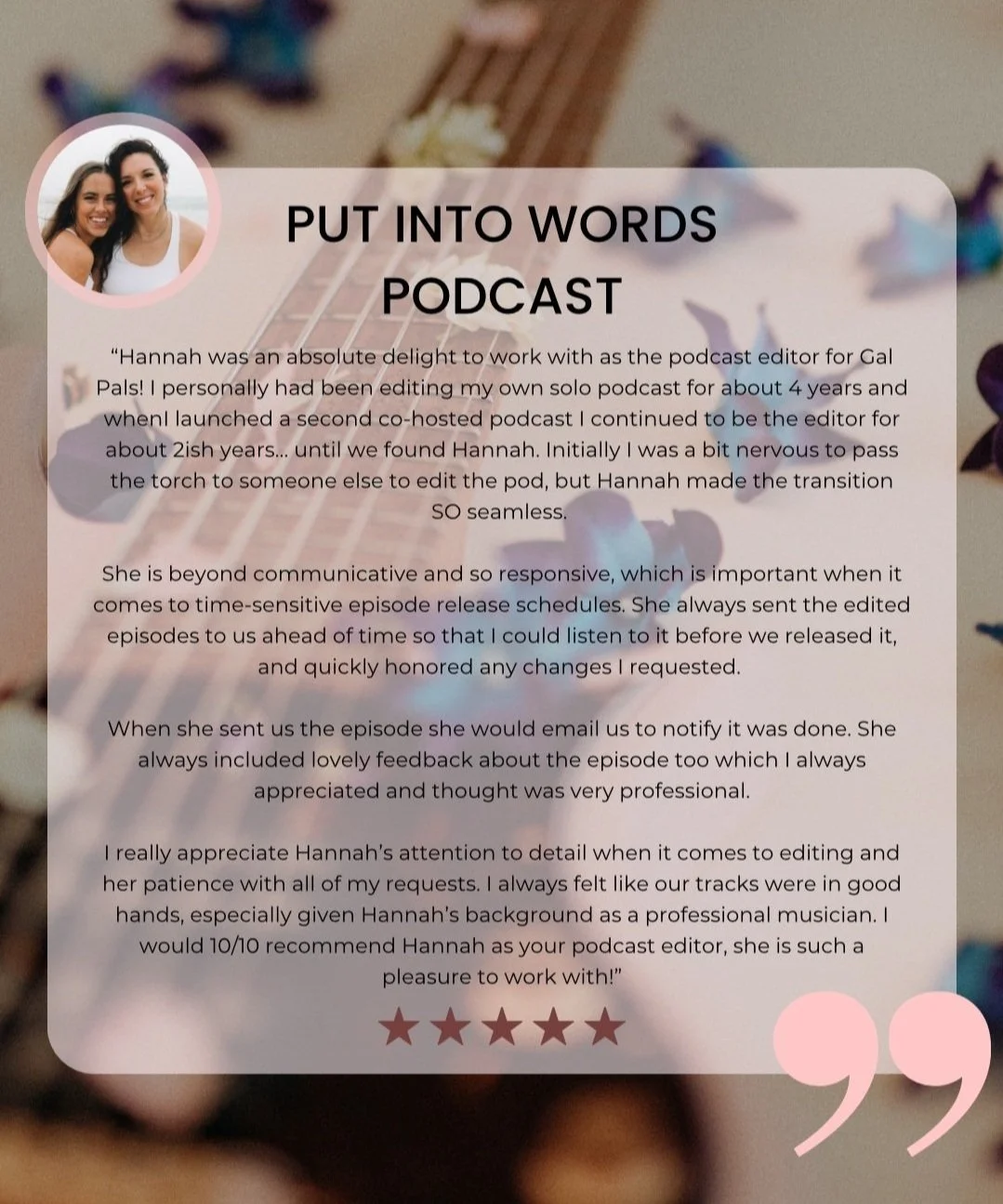 “Hannah was an absolute delight to work with as the podcast editor for Gal Pals! She is beyond communicative and so responsive, which is important when it comes to time-sensitive episode release schedules. She always sent the edited episodes to us ahead of time so that I could listen to it before we released it, and quickly honored any changes I requested. -engrid latina, put into words podcast